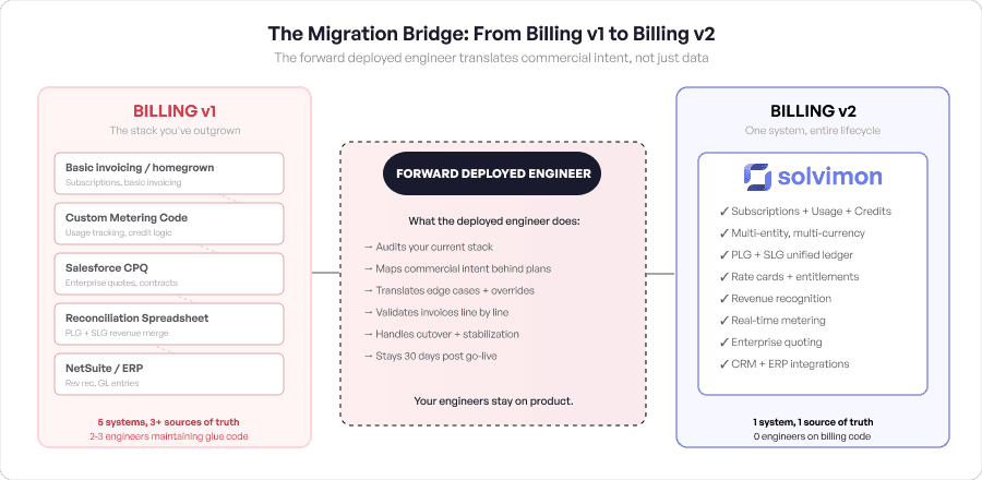 A Solvimon engineer sits inside your migration, working alongside your finance and engineering teams, handling the translation between your old system's logic and Solvimon's architecture. They're reading your billing's webhook configs, understanding why customer #1337 has a pricing override that nobody remembers creating, and mapping the commercial intent behind every plan, not just the data schema.