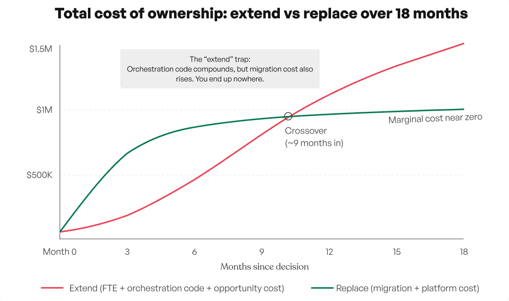 The crossover happens around month 9 - before that, extending looks cheaper. After that point, the gap only widens because every extension adds orchestration code, and orchestration code compounds. The credit system you bolt on today becomes the integration you maintain forever. The reconciliation script you write this quarter becomes the process nobody touches next year.