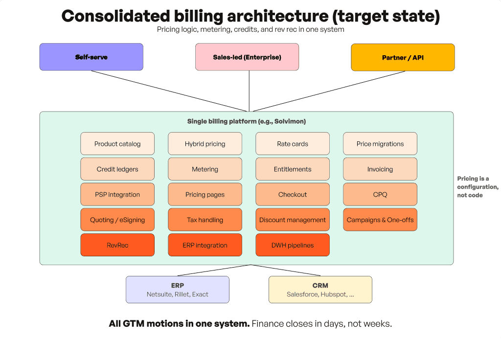 One system, one ledger. Solvimon consolidates the core billing lifecycle with product catalog, metering, rating, credit ledger, invoicing, entitlements, and revenue data all in one platform. You still integrate with payment providers, tax engines, and your ERP, but these are clean integrations rather than orchestration code. The difference between the old state and the new state isn't fewer boxes. It's fewer arrows. When the core billing logic lives in one system, the orchestration code disappears because the complexity moved from your codebase into infrastructure designed to handle it.