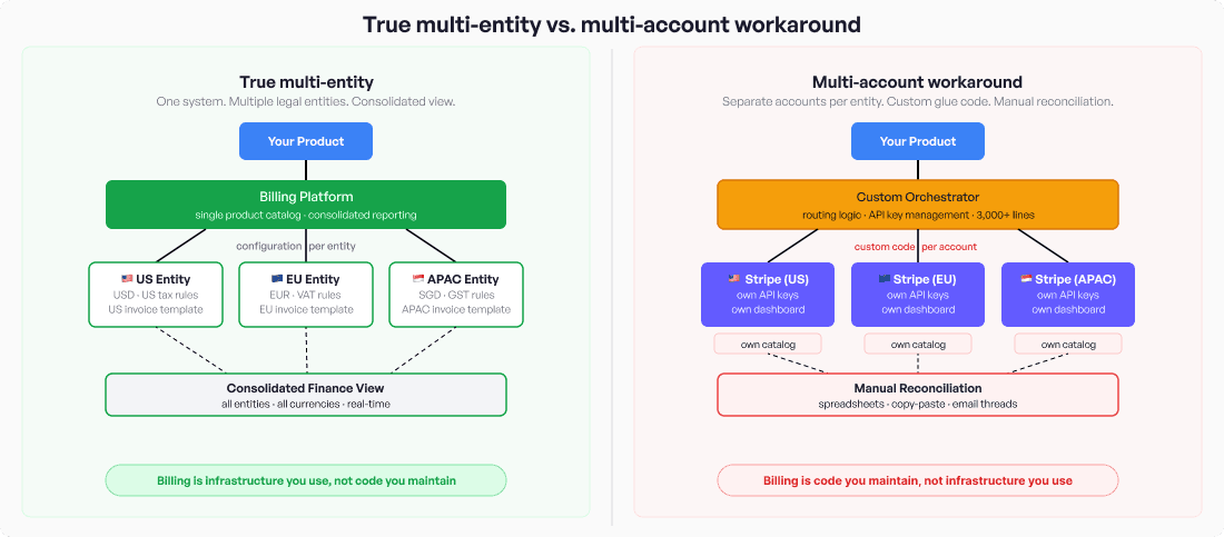 Read that last line again - because most companies end up with multi-entity billing by accident: one Stripe account per country, separate configurations per subsidiary, manual consolidation in spreadsheets.