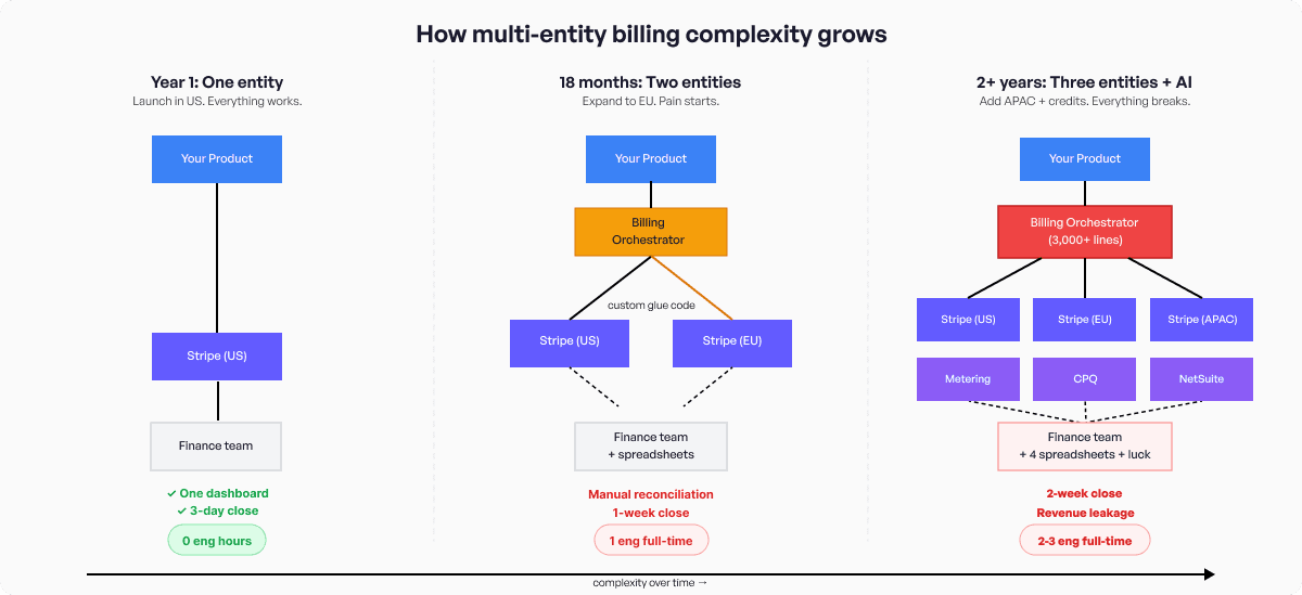 We've seen how companies do this before: launch with Stripe for entity one. Add a second Stripe account for entity two. Build custom code to unify them. Add usage-based pricing. Build more custom code. Add a third entity.