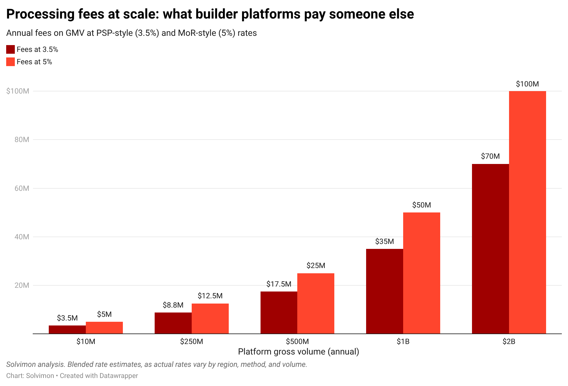 Assumptions: Blended processing rate of 3.5% (PSP-style pricing) to 5% (merchant-of-record-style pricing). Real-world rates vary by region, payment method, and chargeback profile. Excludes interchange-plus arrangements at high volume.