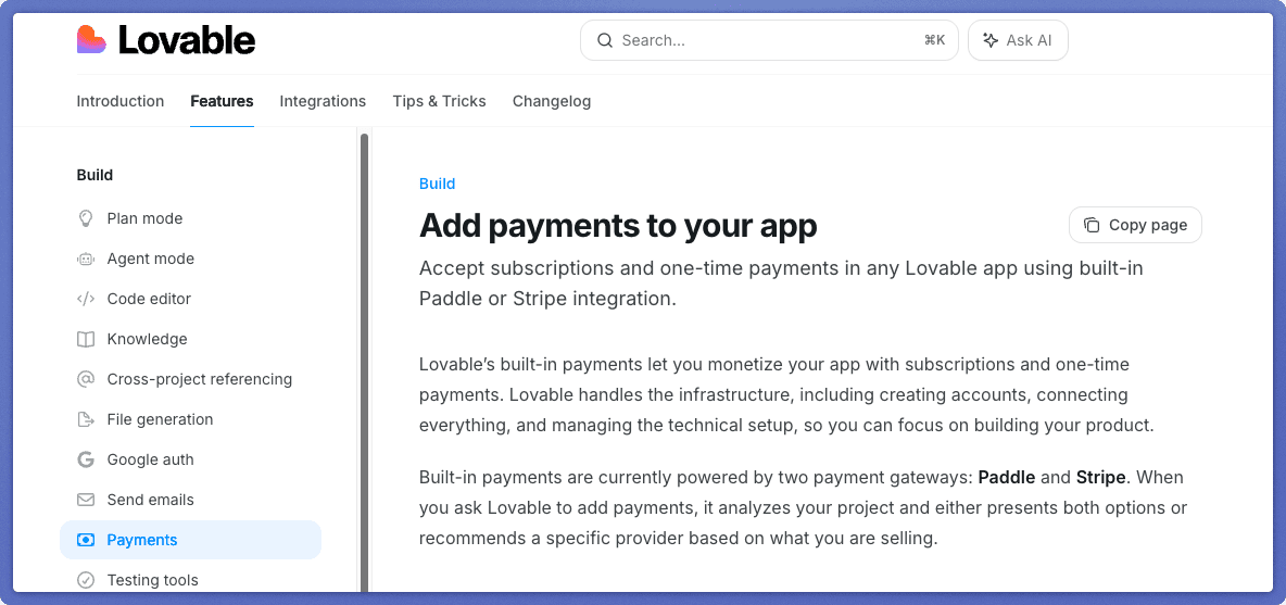 Last week Lovable shipped Lovable Payments with subscriptions and one-time purchases for every app built on the platform, integrated in minutes, with a third-party processor doing the heavy lifting underneath.