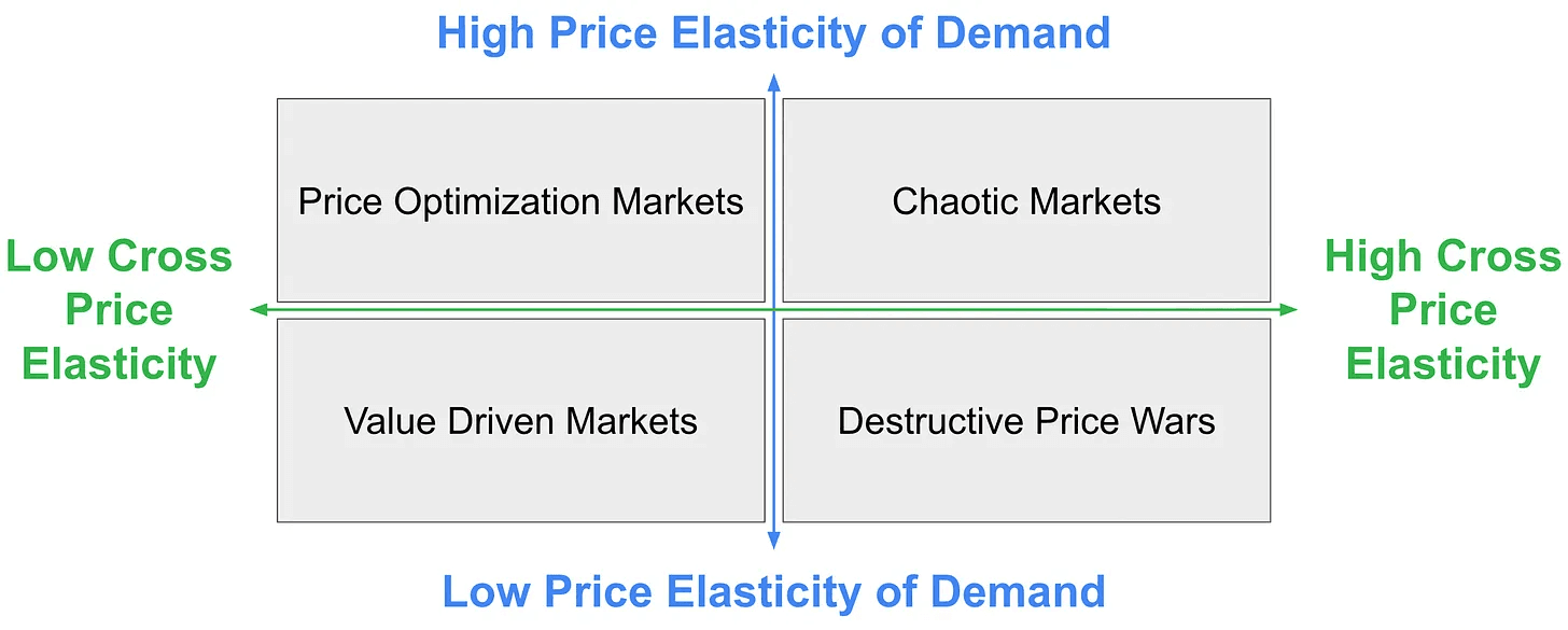 Steven Forth published a framework that makes the problem concrete. He maps pricing along two axes: price elasticity of demand (how sensitive the market is to your price changes) and cross-price elasticity (how much a competitor's price move pulls your customers). Which quadrant you're in determines whether you should optimize, differentiate, defend, or restructure.