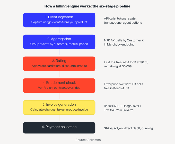 A billing engine is the system that turns product usage and contract terms into money. It sits between your product (which generates events) and your bank account (which receives payments), handling everything in between: metering what customers consumed, applying pricing rules, generating invoices, collecting payments, and feeding revenue data to your general ledger.