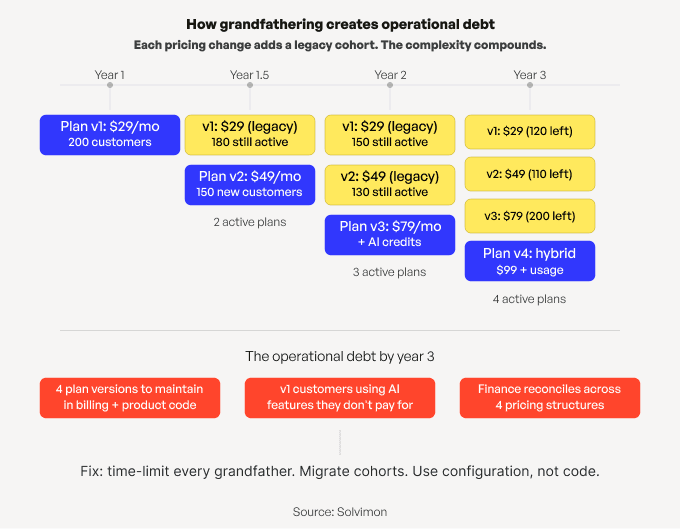 Companies that change pricing every 6 months (as Bessemer recommends) and grandfather each time can accumulate 6-8 legacy plans within three years. Each one is a support burden, a billing edge case, and a source of invoicing errors.